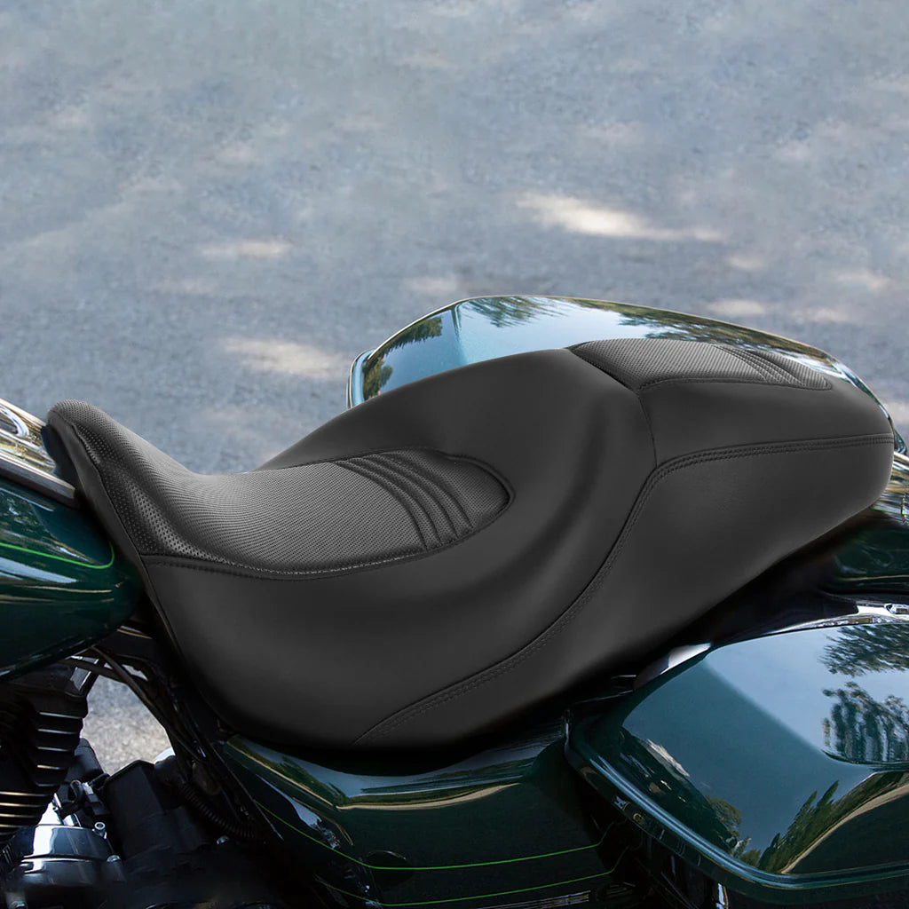 Un asiento 2-up touring diseñado para viajes más largos. El profundo asiento del conductor proporciona un excelente apoyo para la zona lumbar y contribuye a una comodidad duradera, mientras que la generosa sección del pasajero garantiza un viaje cómodo incluso en trayectos largos.