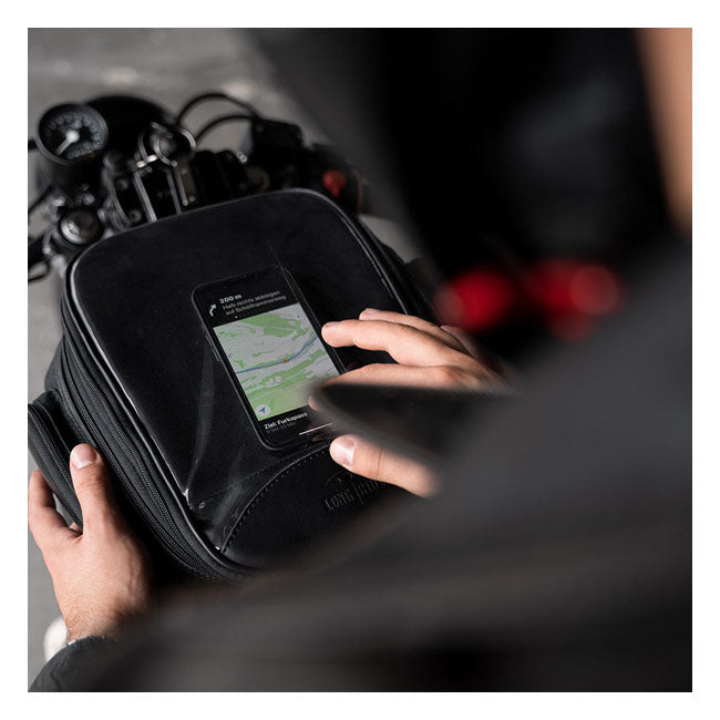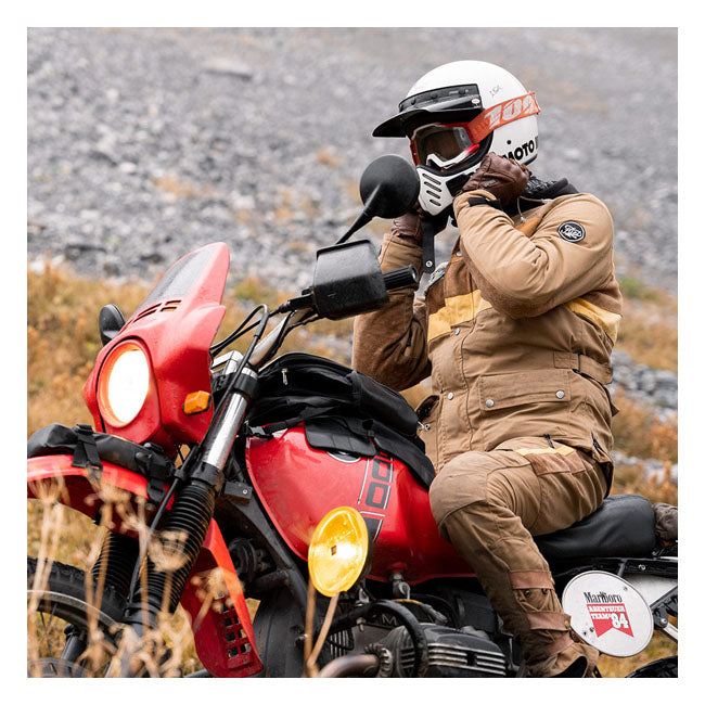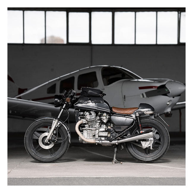 La bolsa para depósito encerada Heritage es perfecta para motos retro, café racer y clásicas. Fabricada a mano con sarga de algodón encerado grueso y cuero curtido vegetal, se fija magnéticamente y ofrece almacenamiento ampliable cuando es necesario. Una base de goma blanda protege la pintura del depósito, mientras que una funda para la lluvia integrada garantiza que tu equipo se mantenga seco. Cuando no estés en la moto, llévala con el asa superior de cuero.