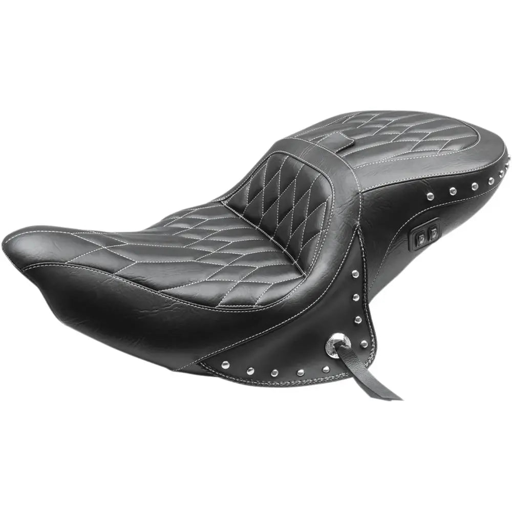 El Standard Touring calefactado 2-Up de Mustang transforma la Indian Roadmaster en una auténtica máquina para largas distancias. El conductor se sienta ligeramente más abajo y más atrás que con el asiento de serie, lo que crea una sensación de conducción relajada y cómoda. El sistema de calefacción de dos zonas integrado permite al conductor y al pasajero ajustar sus niveles de calor de forma individual mediante controles discretos ocultos bajo la funda con costuras en forma de rombo. El respaldo incluido es ajustable, extraíble y se puede plegar cuando no se utiliza. Un asiento duradero, cómodo y bien diseñado, construido para recorrer muchos kilómetros por carretera.