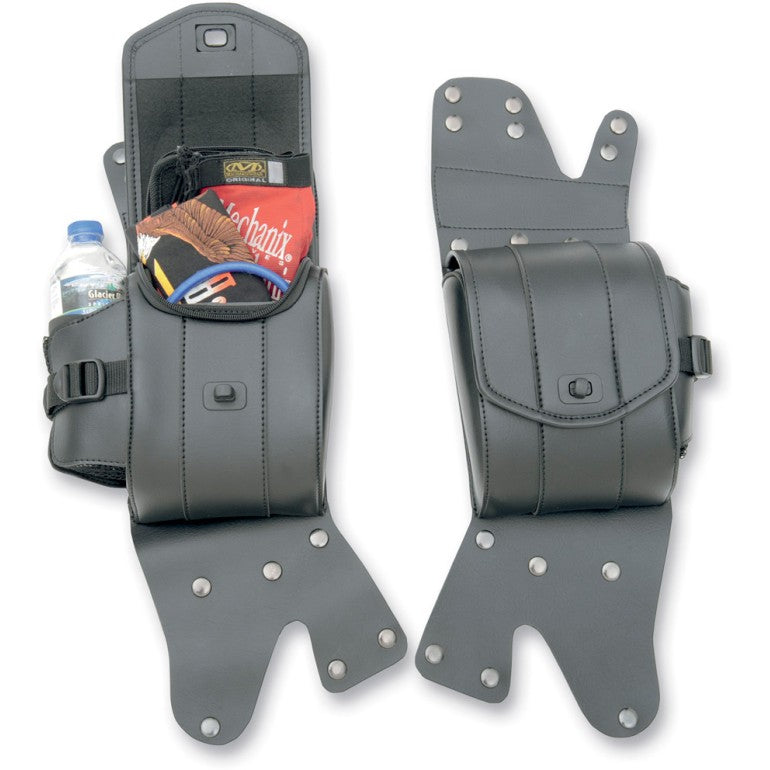 Estas bolsas protectoras añaden un práctico espacio de almacenamiento a los modelos Harley Touring con protectores de alforjas. Fabricadas en SaddleHyde de 3 mm de grosor, son resistentes a los rayos UV y a la intemperie, y cuentan con un cuerpo rígido que mantiene su forma. Cada compartimento tiene cremallera y está protegido por solapas contra las inclemencias del tiempo, además de cierres de cuarto de vuelta que admiten mini candados para mayor seguridad. Se montan sin herramientas, encajando en los protectores con almohadillas antideslizantes, e incluyen portabebidas de malla plegables para cuando los necesites.